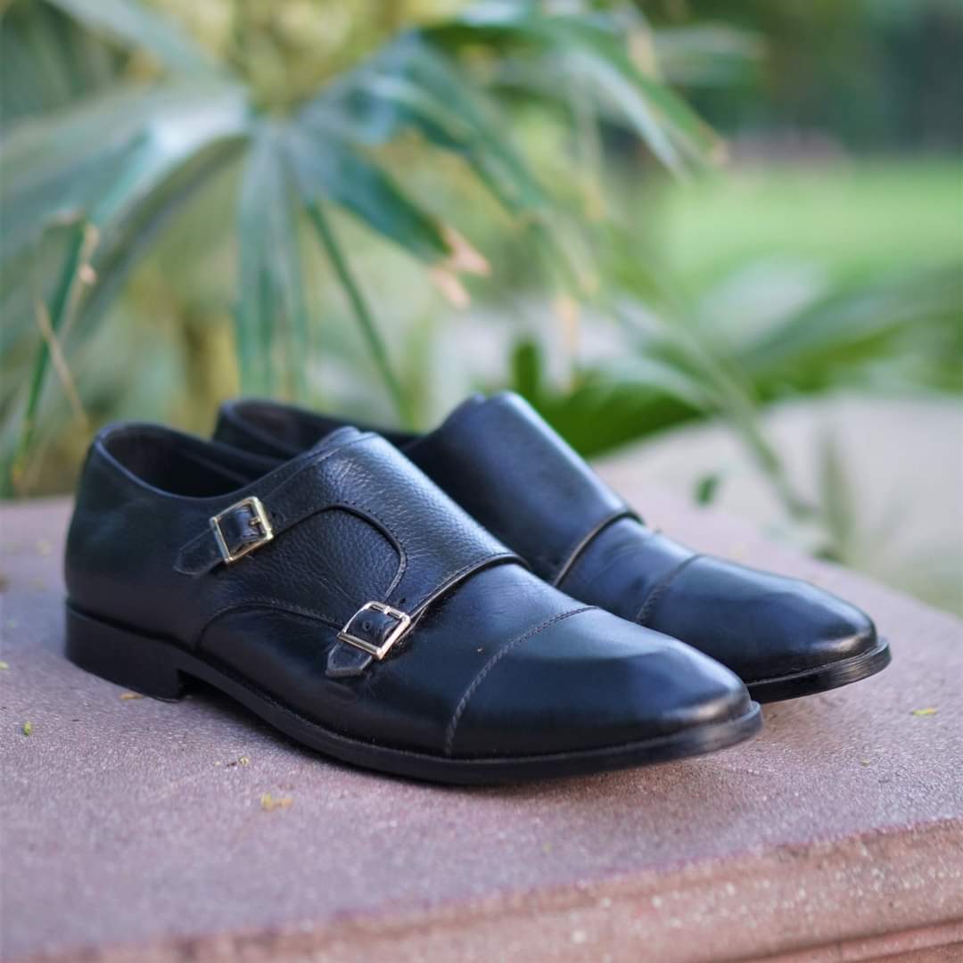 Black Double Monk Shoes for Men Cap Toe Dress Shoes